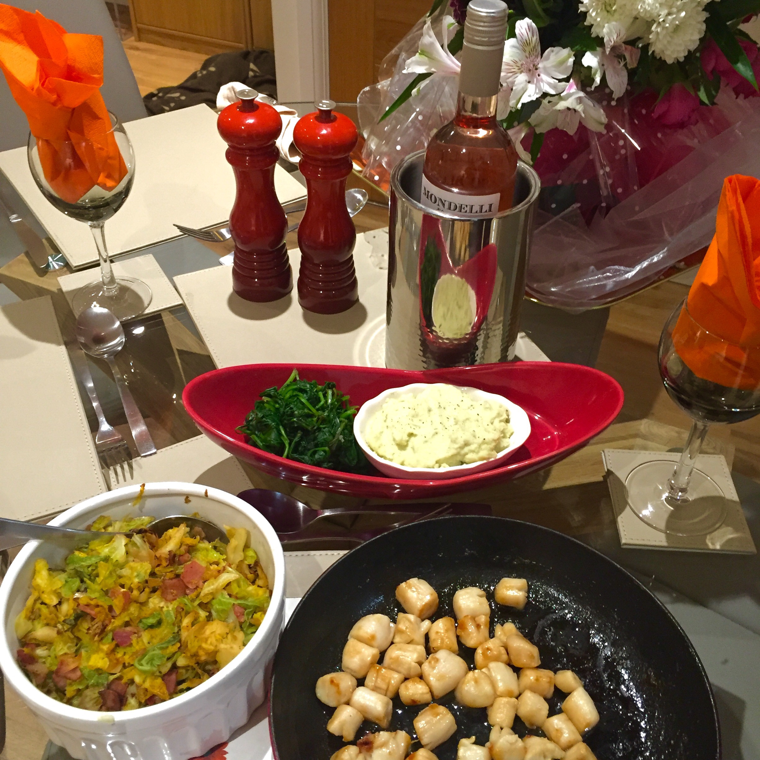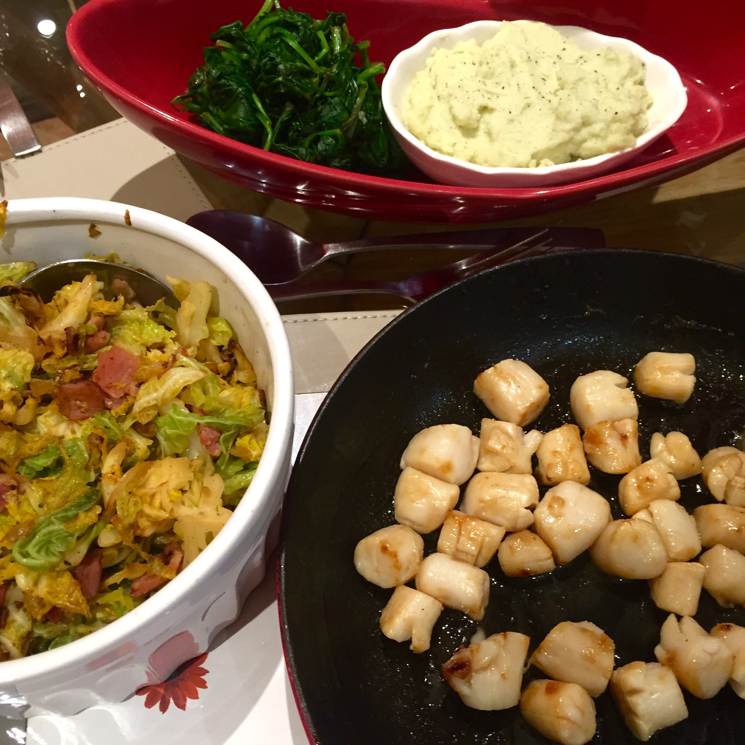 So after what seems like the quickest term ever, I’m back home again for the Easter hols. Mum decided we should have fish tonight because it’s Good Friday today and apparently its traditional, so we decided to treat ourselves and have scallops. I bloody love scallops. So much. I served them with sautéed spinach, cauliflower purée and bacon cabbage. I decided to simply pan fry the scallops in some butter, because I think their sweet flavour is just too good to overcomplicate with any other flavours. The extra oil is just because butter burns quite quickly, so combining it with oil stops this from happening. You want to use an oil that has a high smoke point, because some oils, like olive oil, don’t do well at high temperatures and can release toxic chemicals. So something like a sunflower or ground nut oil would be perfect in this dish, because they have high smoke points as well as being relatively flavourless. Anyhoo, enough about oils, back to the dream that is scallops. They caramelised in my pan just beautifully, so I decided to make the left over sweet buttery goodness into more of a sauce by adding a tiny glug of wine. Despite being a student and drinking pretty much anything, I really don’t like Chardonnay, so I decided to use it up by putting it in this dish. It’s fairly dry acidic-ness meant it was actually a really good contrast with the sweet scallops. Similarly, the slightly bitter spinach and the salty bacon contrasted perfectly. The cauliflower in the purée was boiled in milk and vanilla, which may seem a bit odd, but it added something different and just worked wonderfully.