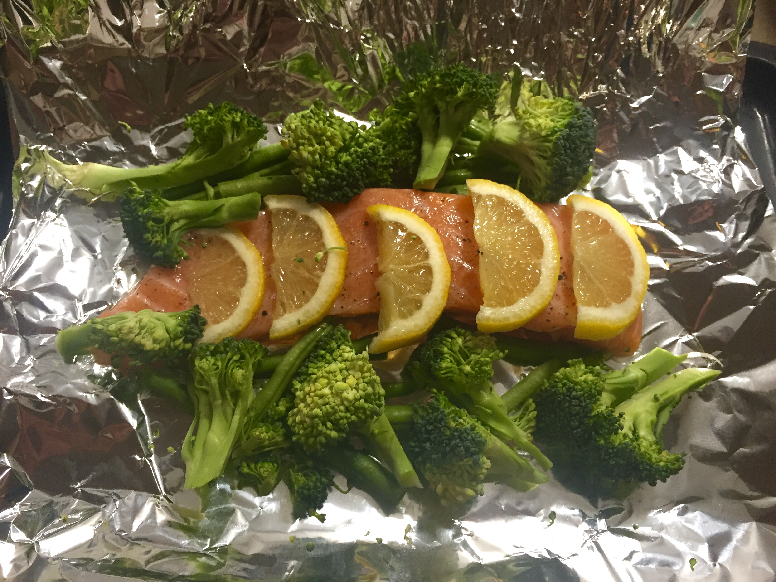 3. Chop the broccoli into small bite size pieces. Top and tail the beans before chopping them in half. Pop the broc and beans on the baking tray either side of the salmon. Fold the ends of the tin foil into the middle, squeezing the ends together to create an enclosed little parcel. Bake on 180 degrees for about 15-20 mins (depending on the size of your salmon)
