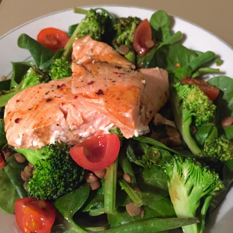4. Meanwhile, prepare your salad ready for your lentils and salmon. Once they’re cooked, combine with the salad and serve.