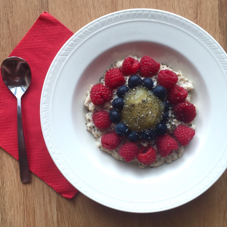 So I’ve done my HIIT, and all of a sudden I feel absolutely ravenous, so want something quick that is high in protein and carbs, to help out my muscles and replenish the energy I’ve just used up. This is def one of my favourite post training breakfasts – vanilla protein porridge topped with raspberries, blueberries and stewed apple purée, sprinkled with chia seeds. It almost goes a kind of cake-like texture thanks to the protein powder, which is really just another winner at breakfast time. To make this I just add a scoop of protein powder to a normal porridge mix before heating, along with a some extra water. Chocolate protein powder is as equally delicious, and you can basically add whatever toppings you fancy.