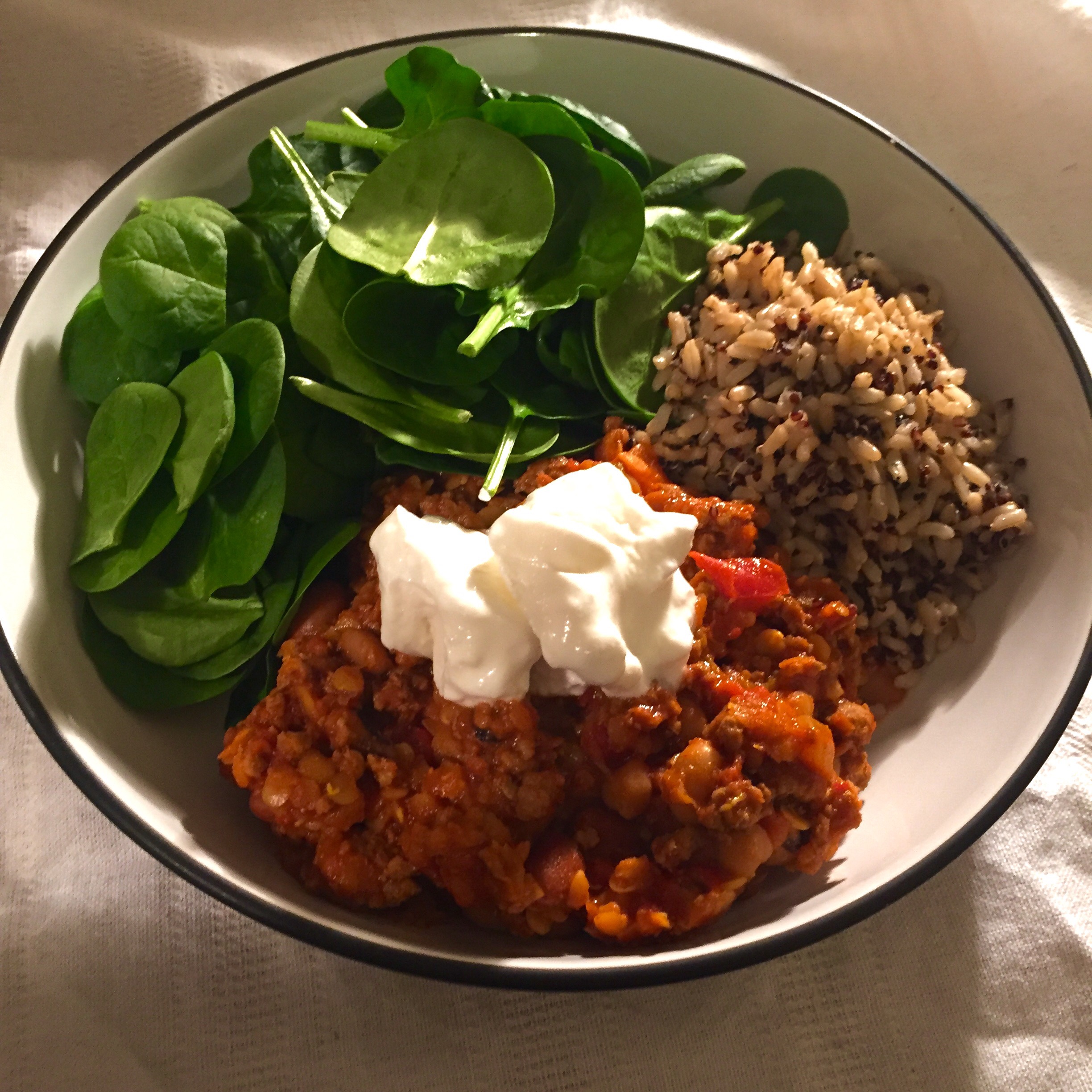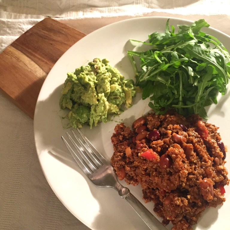 Had a little rummage through my freezer today and came across some ostrich mince I picked up ages ago from my local Farmers’ Market back at home. Having spent the whole week in the library, I decided it was time for something nice for dinner, and the ostrich mince seemed like the ideal option. I made it into a kinda chilli, with mixed beans and left over quinoa to pad it out a little. This took me about 15 minutes to make and it was just great. Obviously I don’t normally make my chilli with ostrich mince – turkey mince is normal my go to mince, as it’s cheap but also lean. However ostrich is such a tasty meat, and one that is naturally very lean. Winner winner ostrich dinner.