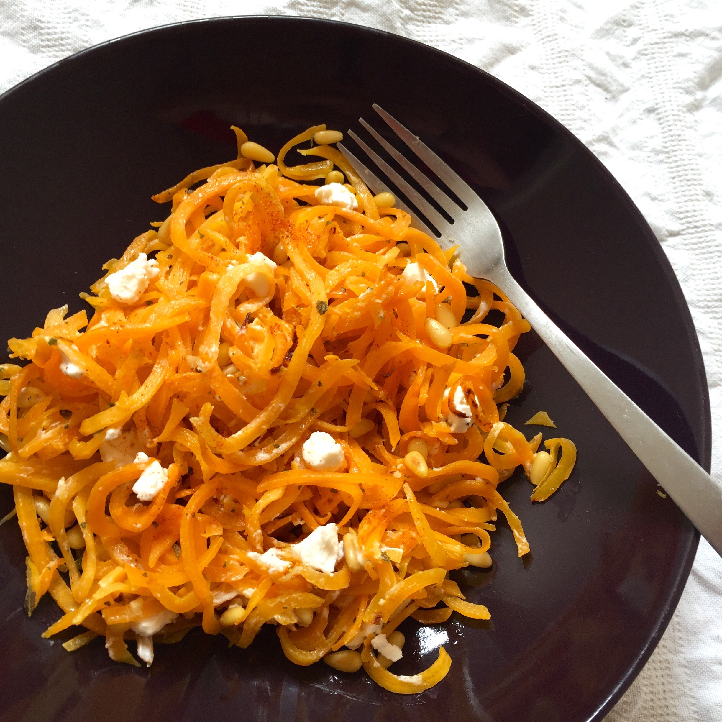 1. Heat the oil in a frying pan, crush the garlic into it and add the sage, butternut squash noodles and lemon zest. Mix together and cook on a medium heat for about 2 minutes.