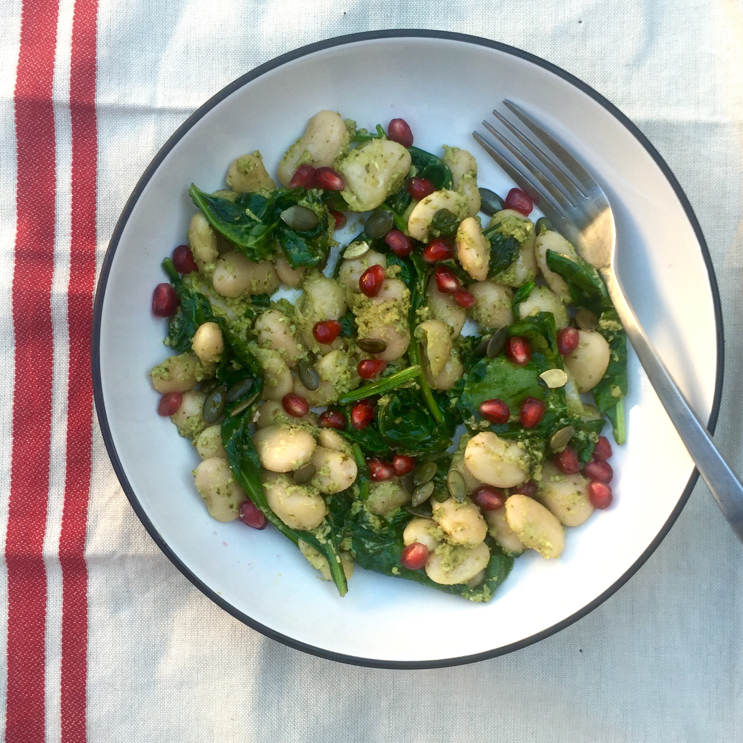 I had a little browse through my many recipe books, and came across a Deliciously Ella pesto and butter bean recipe. I’ve had a tin of butter beans in my cupboard for a little while after mistakably picking them up thinking they we chickpeas (fml), so this was perfect and delicious. Every cloud has a silver lining and all. I’ve also got a little/incredibly obsessed with pomegranate – it’s summery, so tasty and looks super pretty. Kinda like a little summery jewel. In my tummy.