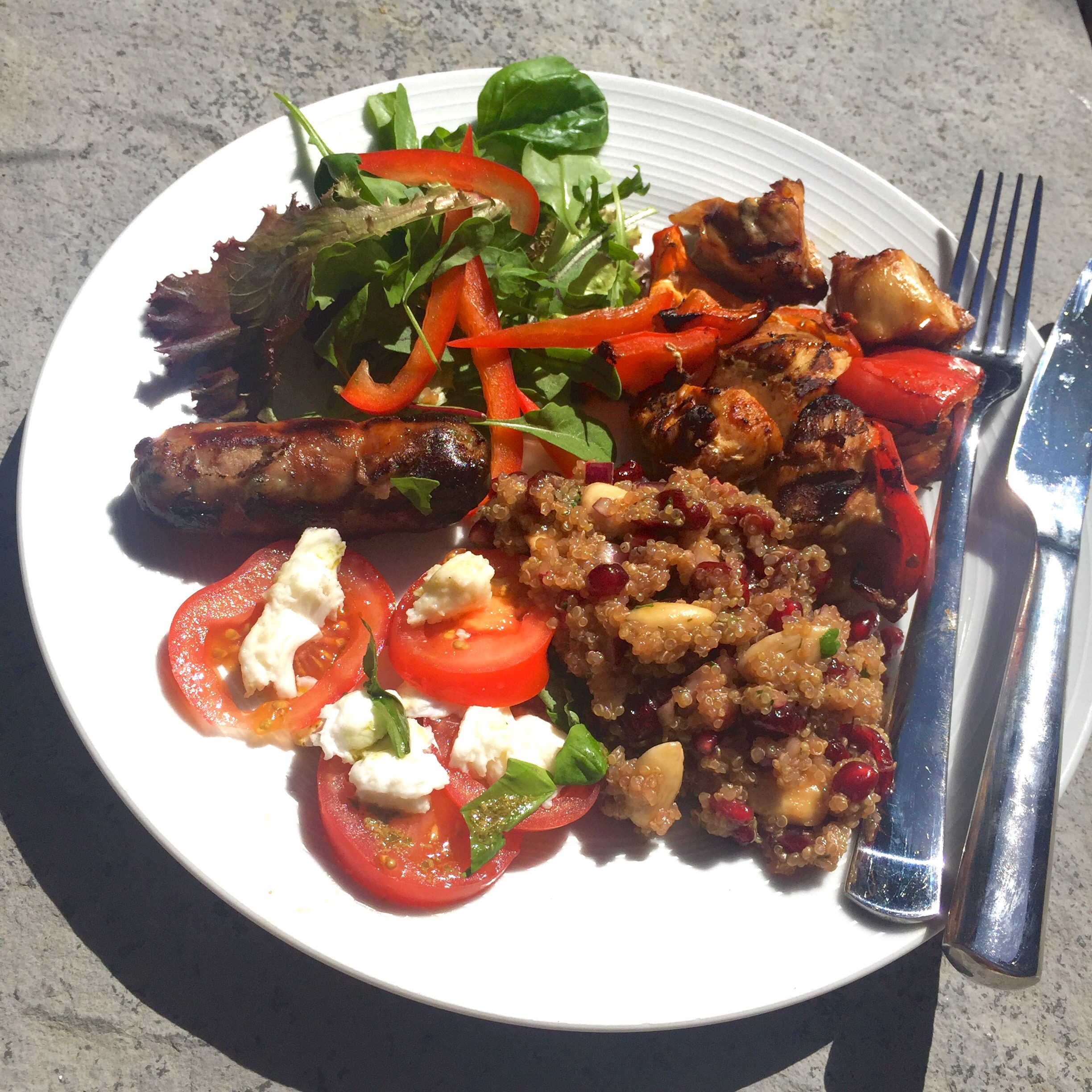 We had chicken skewers, pork and leek sausages, a mixed green salad, a caprese salad with pesto olive oil, and the mother of all quinoa salads. It was all pretty delish even if I do say so myself, especially the quinoa salad. I think it even got my bro’s approval as he commented “this couscous salad is so good”. Almost bro. Its the thought that counts. The chicken skewers were basically the chicken I cook all the time but shoved on a stick – soy sauce, grated garlic and ginger, and a chilli flakes, with the addition of some red pepper thrown on the stick too. The caprese is a classic, and with dad’s basil plant currently looking much bigger than my future, it was an inevitable addition to the table. The quinoa salad was inspired by one I had at a family friend’s the other day, and it’s simply too good not to share. You’re welcome.