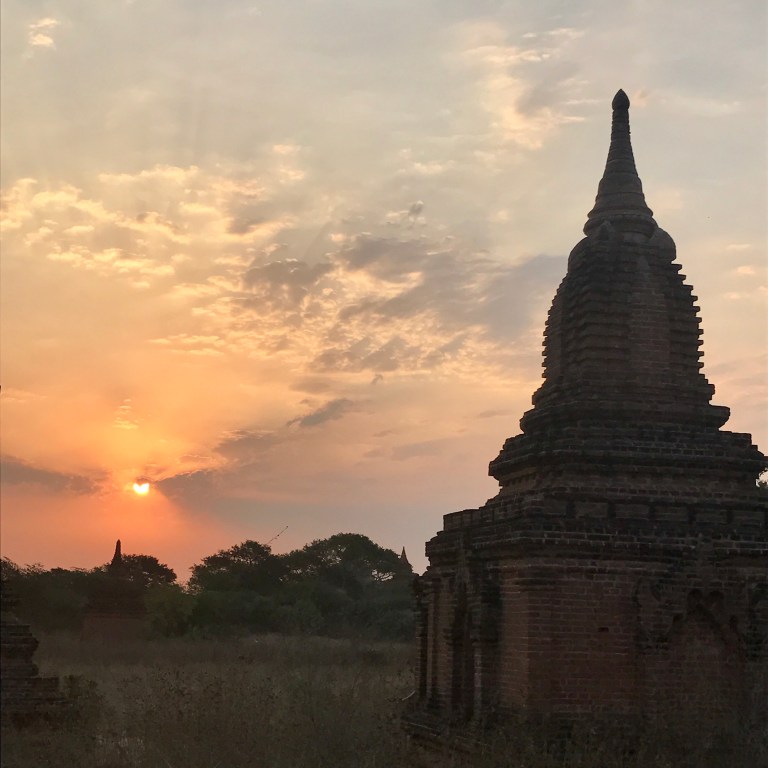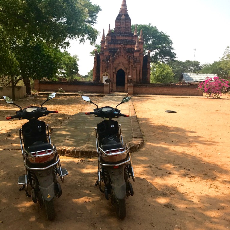It took us about 15 minutes for us and a few others to negotiate with the taxi drivers but we finally got to our hotel. Our room wasn’t ready, so we decided we may as well hire an electric moped and whiz off to watch the sunrise. We’d heard a lot about Bagan and how it is covered in Pagodas, setting you up for a beaut sunrise or sunset, and it really didn’t disappoint. Following the main road before turning off down a dirt track, we came across a pagoda that we could climb to get a better view.